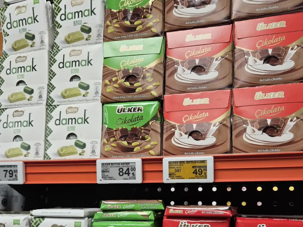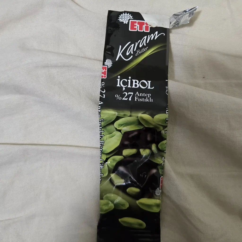 我購買的都是超市價:ETI 開心果巧克力,28 克 45 里拉;ÜLKER 開心果牛奶巧克力,65 克 84 里拉。